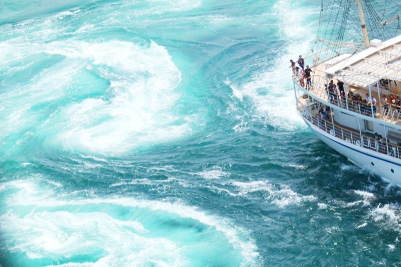 淡路島と四国徳島に挟まれた鳴門海峡は、イタリアのメッシーナ海峡、アメリカのセイモア海峡と並び、世界3大潮流の一つに数えられています。そんな渦潮をまさに目の前で見ることができる観潮船が、淡路島の福良港から出航しています。