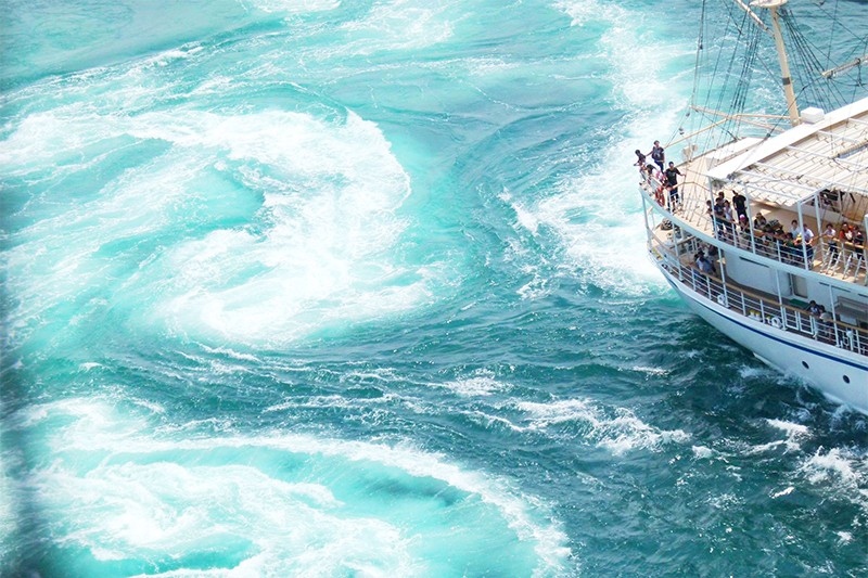 そんな鳴門の渦潮を目の前で見ることができる観潮船が、淡路島の福良港から出航しています。昔の帆船を模したうずしお見物のクルーズ船は旅情たっぷり。港から大鳴門橋のたもとに向かって出港し、潮風を目いっぱいに受けながら大海原を進む約60分間のクルージング体験に、子供の頃に戻ったようなワクワク感を味わえます。
