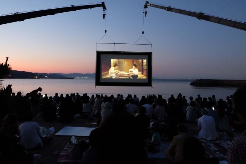 海上に巨大スクリーンを設置して砂浜から映画を楽しめる「うみぞら映画祭」。