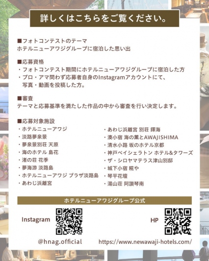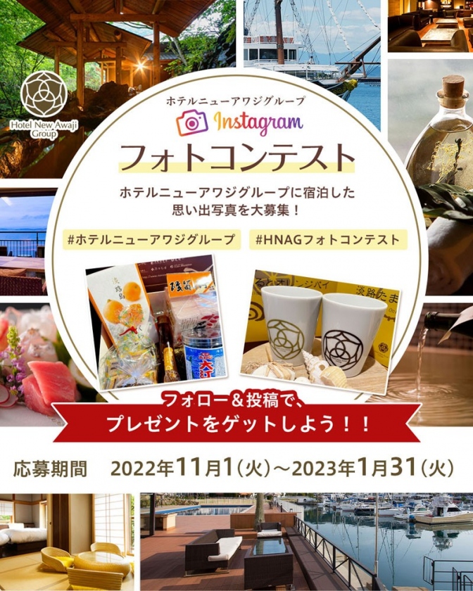 ※フォトコンテストにご参加いただいた方のInstagramの投稿を、フォトコンテストの審査や賞品提供とは関係なく、ホテルニューアワジグループ公式Instagramでご紹介させていただく場合がございます。その場合は、公式アカウントよりダイレクトメッセージを事前にお送りさせていただきます。