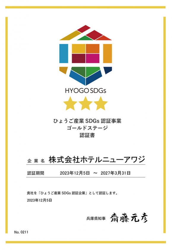 この度、株式会社ホテルニューアワジは兵庫県では6社のみとなる最上位のゴールドステージに認定されました。
